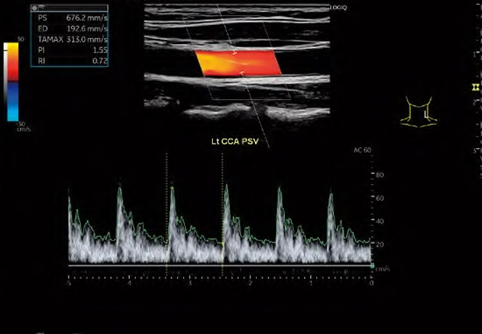 当院では頸動脈エコーを行い、動脈硬化の程度やプラーク*のチェックを行います。